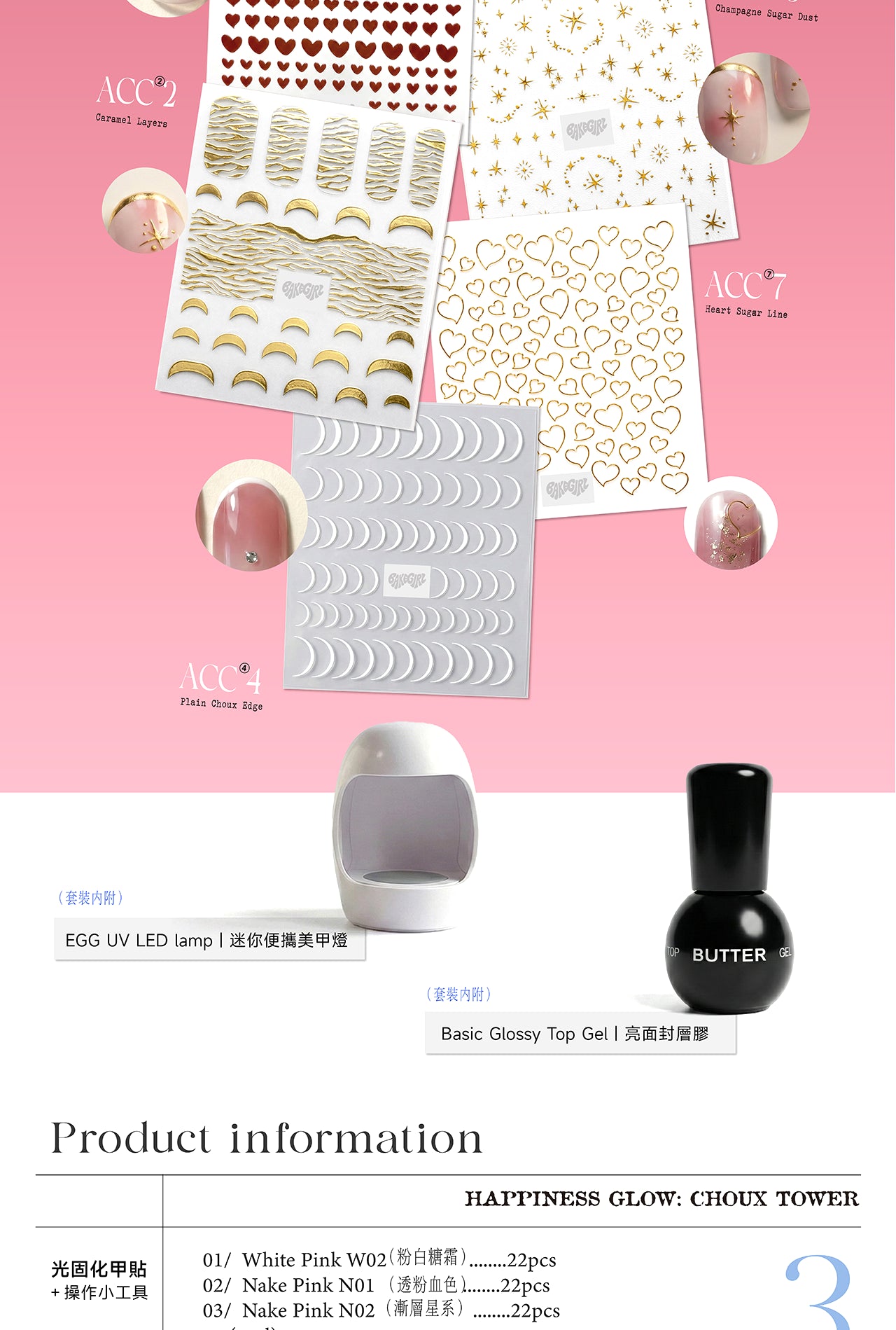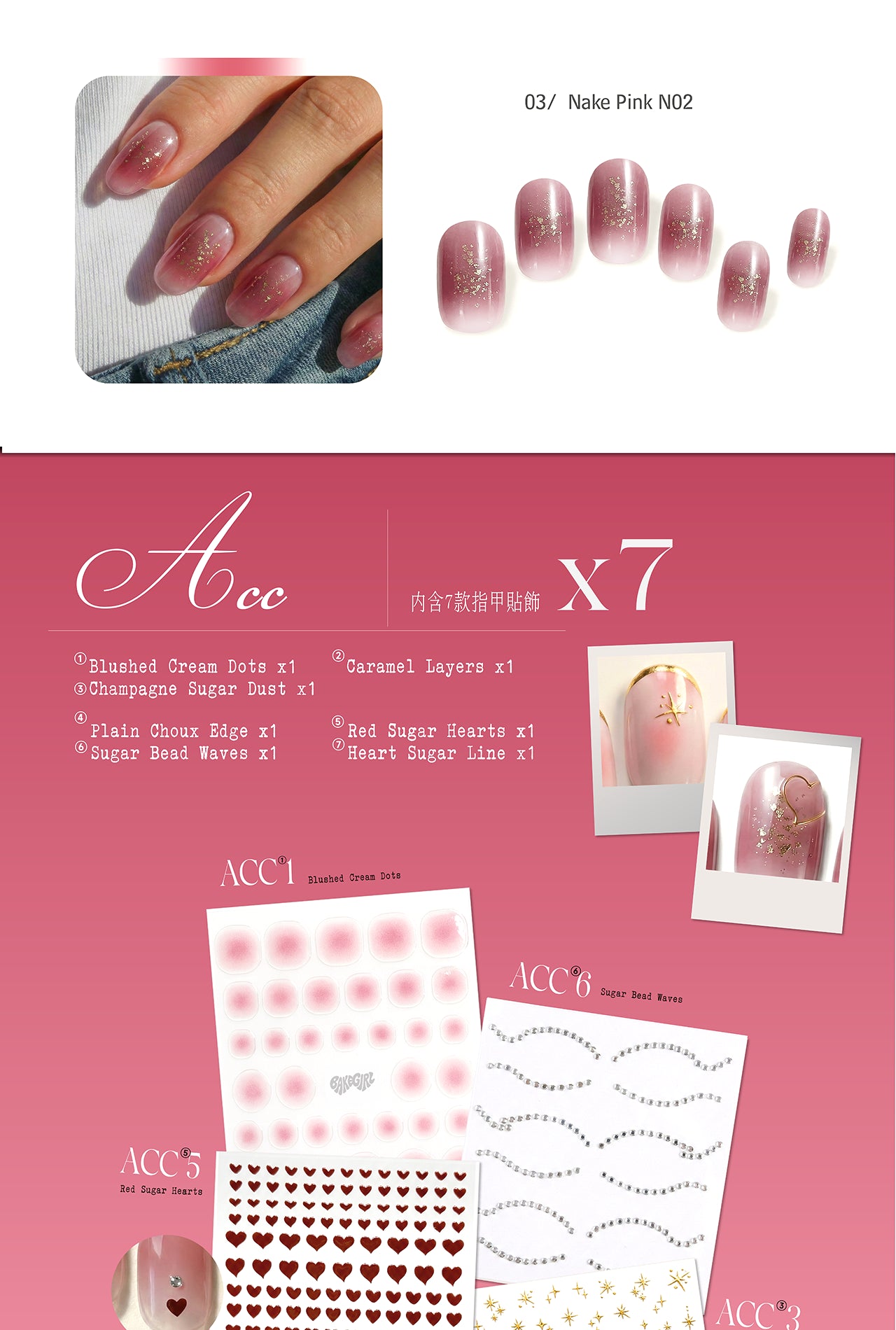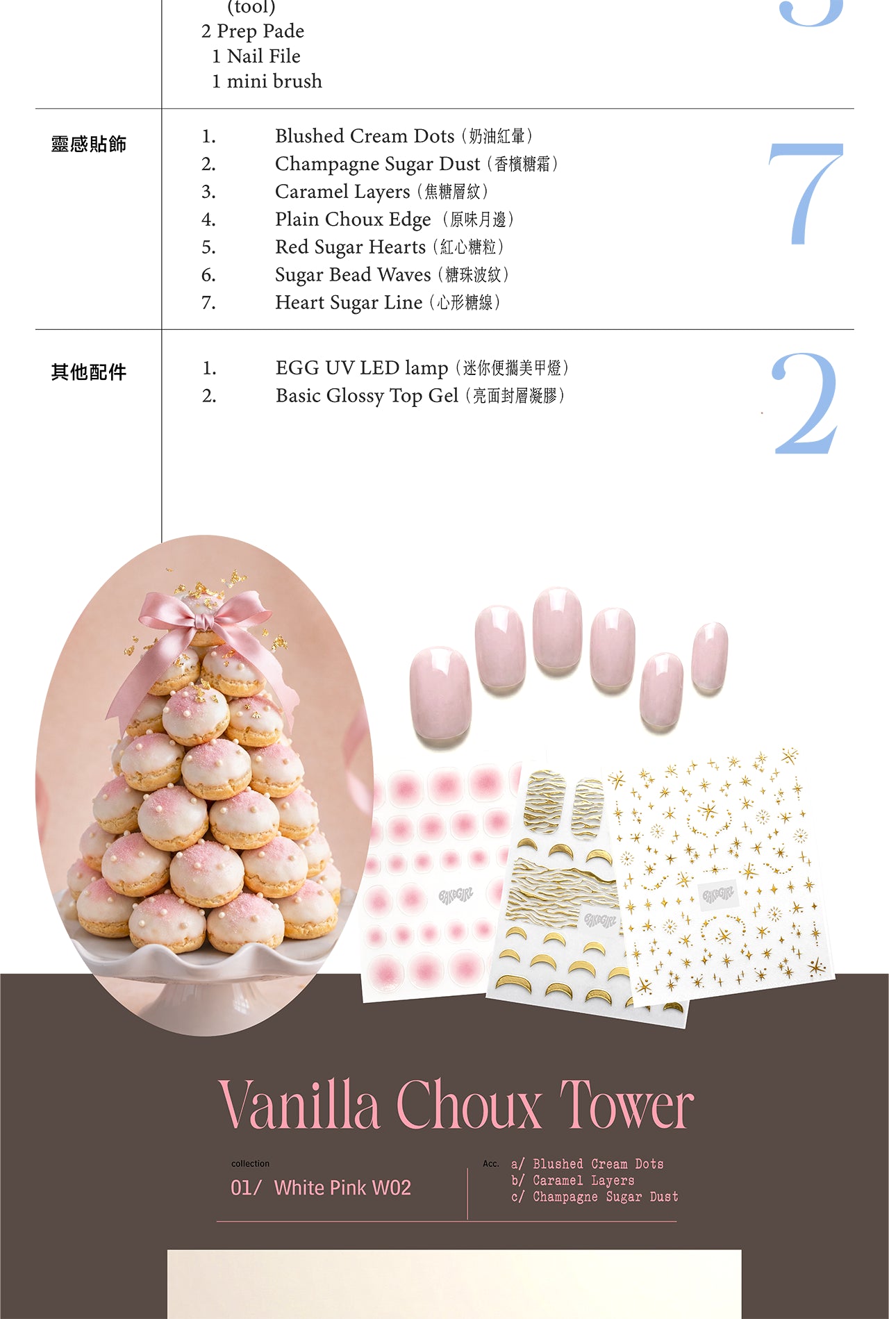 內含: 3款凝膠指甲貼 + 7款飾品 + 美甲燈 + 封層膠 + 工具包
