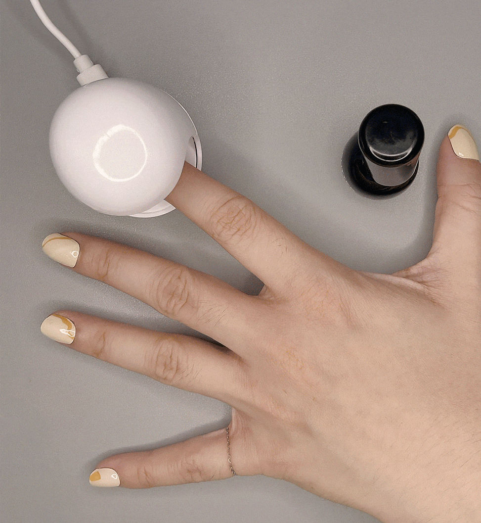 為收納與行動挑選的迷你尺寸光固化甲貼膜與封層膠的硬化,需搭配美甲燈照射。